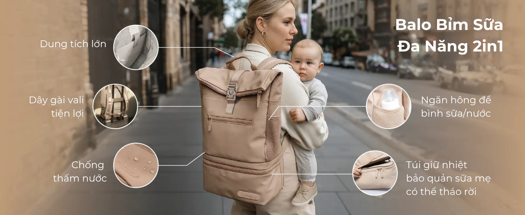 - Thẩm mỹ: Balo bỉm sữa MOOIMOM có thiết kế thời thượng, giúp mẹ vẫn trông thật sành điệu và gọn gàng khi check-in tại các điểm du lịch.